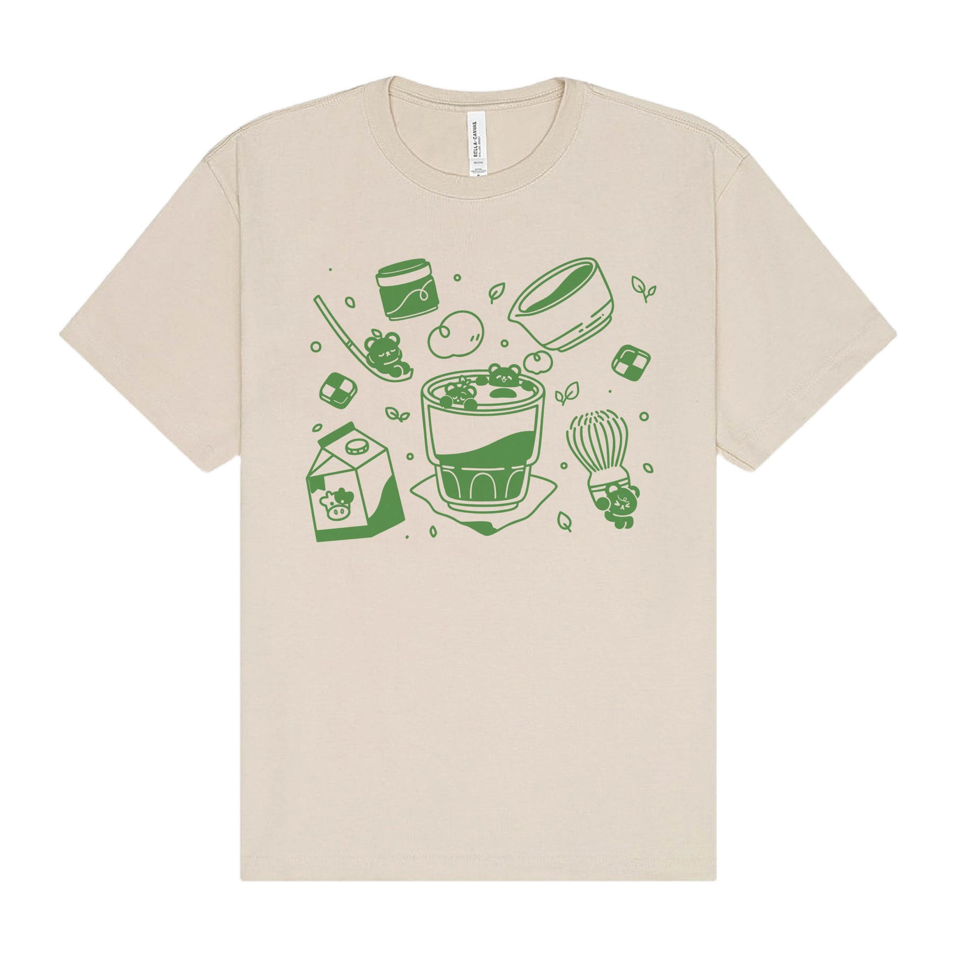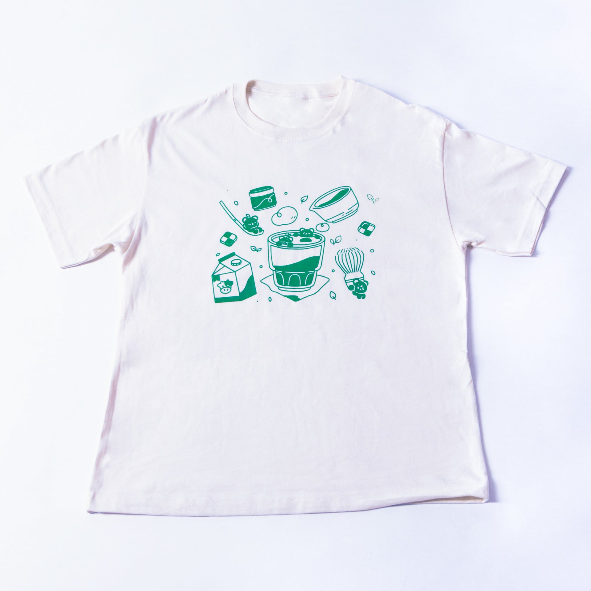 Our Matcha Tee is screen printed in house with water based ink on a natural 100% cotton t-shirt.