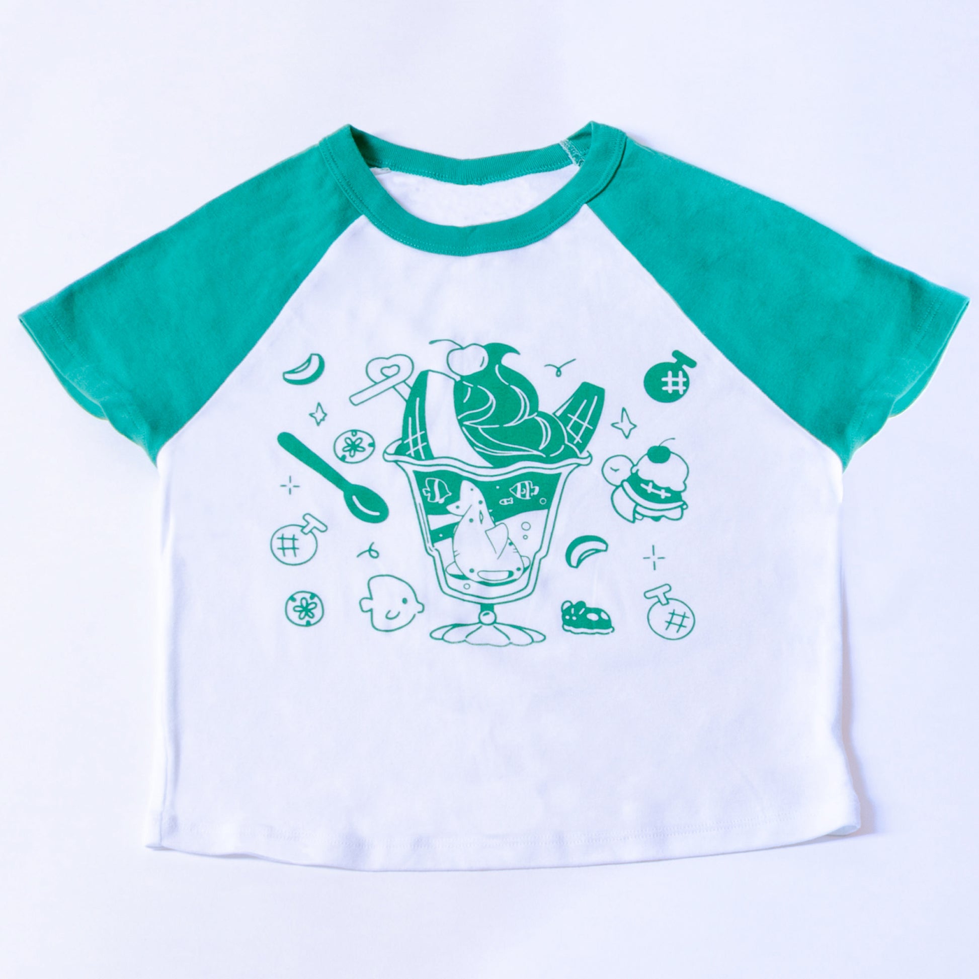 Our Melon Soda Baby Tee Shirt is screen printed in house with water based ink on a Kelly Green baseball styled baby tee.