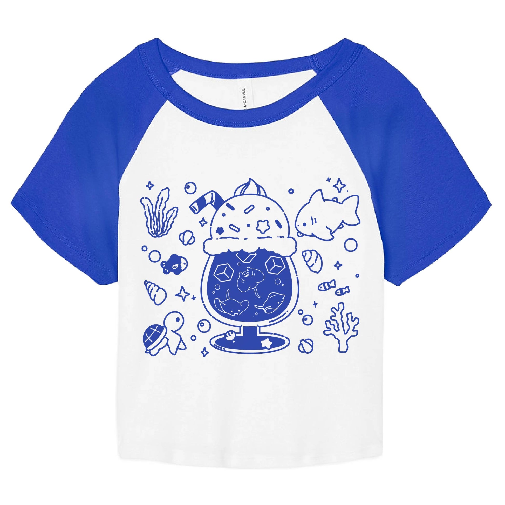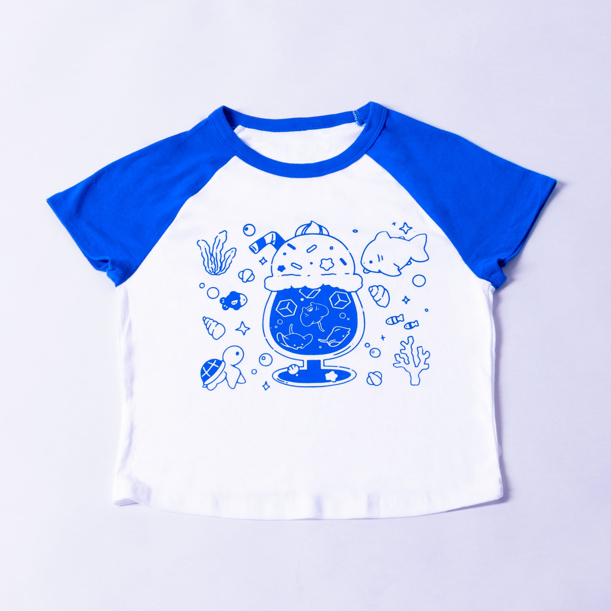 Our Soda Baby Tee Shirt is screen printed in house with water based ink on a blue baseball styled baby tee.
